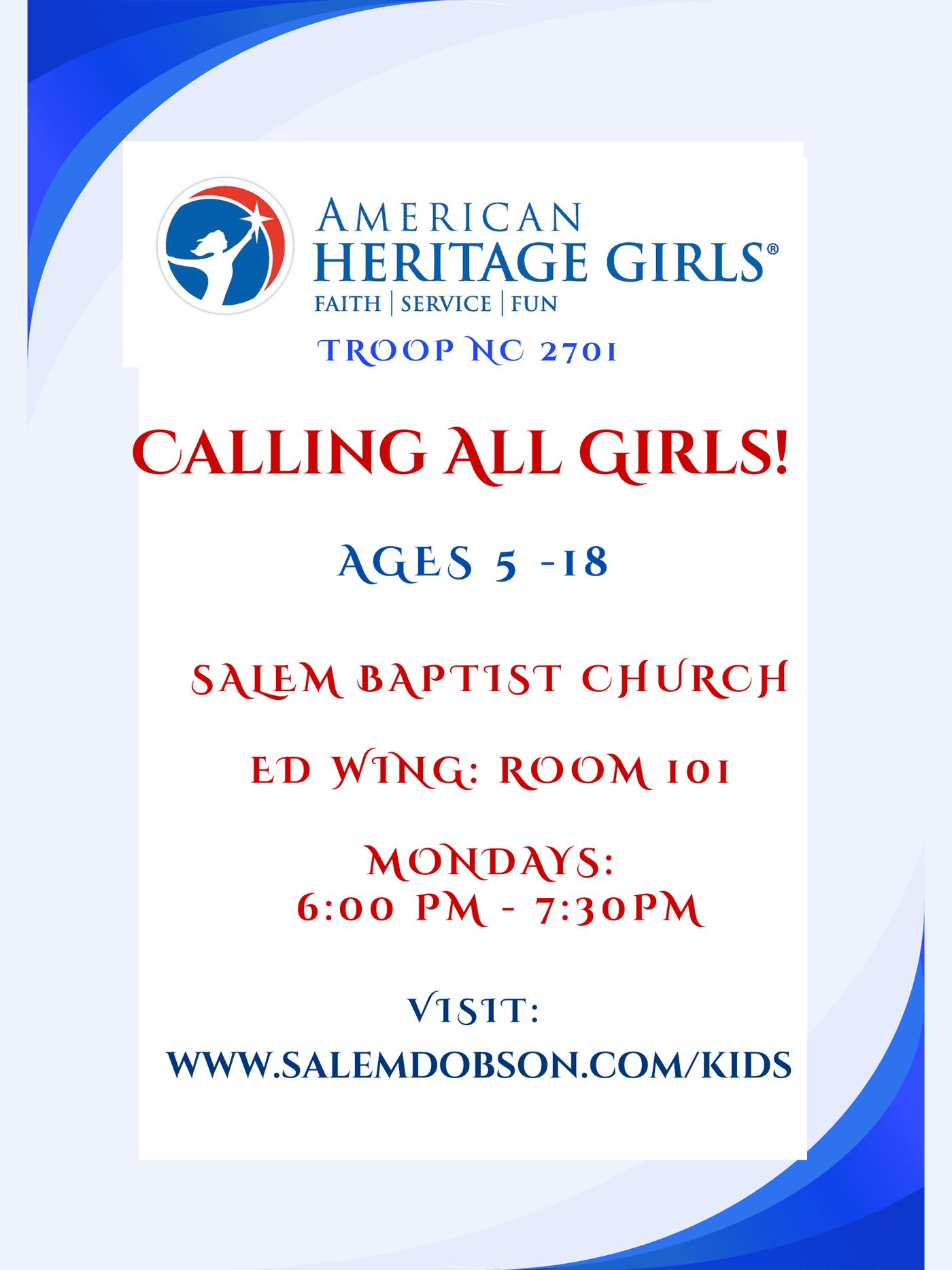 Wednesday, August 27, 2025, is the start of AWANA at Salem. Awana will run from 6:30 pm until 7:45 pm on Wednesdays. AWANA is open to Puggles (2 years old BEFORE August 31) through Truth and Training (5th grade). If you have questions, please get in touch with the church office at 336-371-4419 or email Nicole Boyette at boyettes4christ@gmail.com.